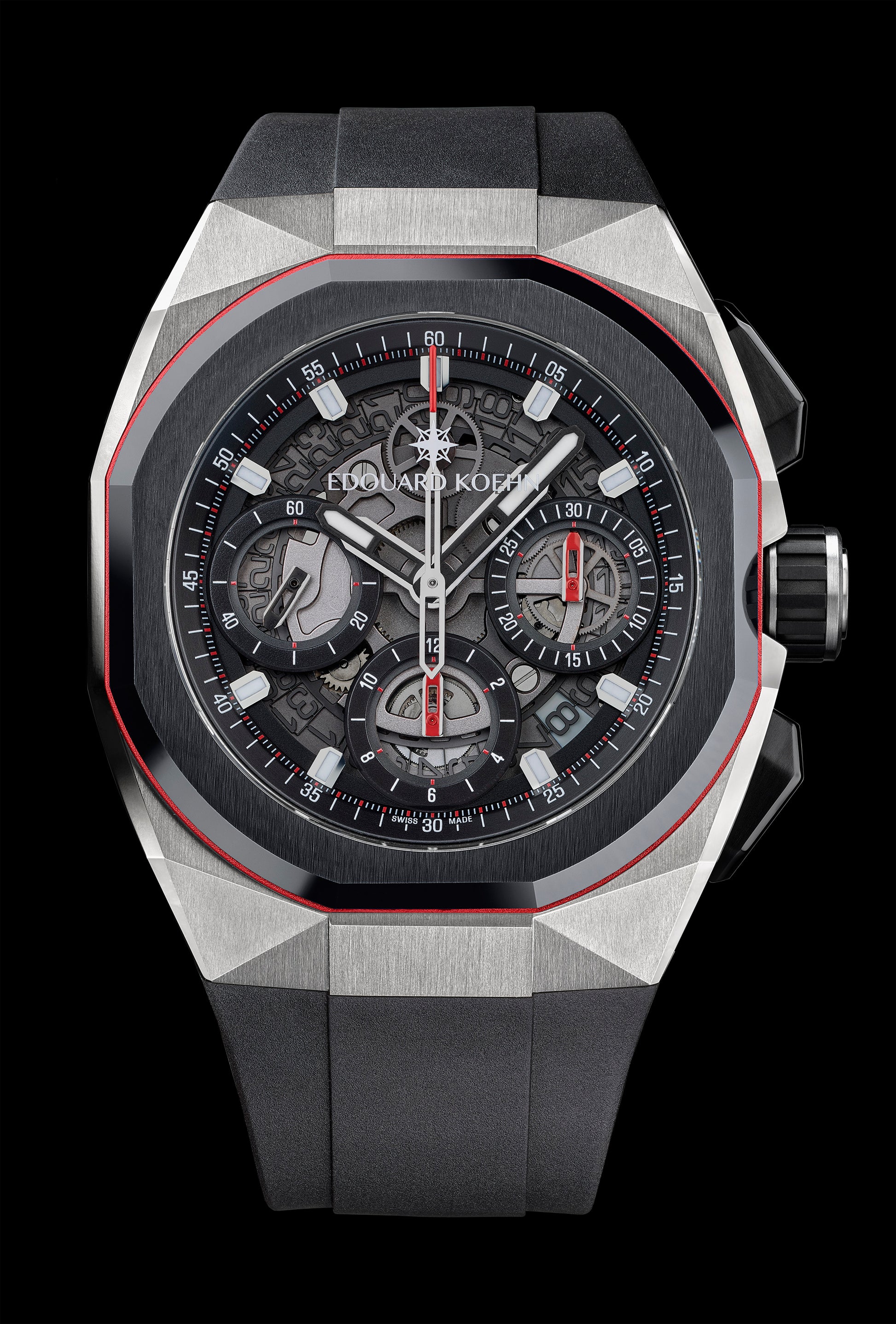 Calibre : EK-CHR-MVT01 Concepto Base –Tri-Compax automatic chronograph, 245 components entirely manufactured in La Chaux-de-Fonds, Switzerland.