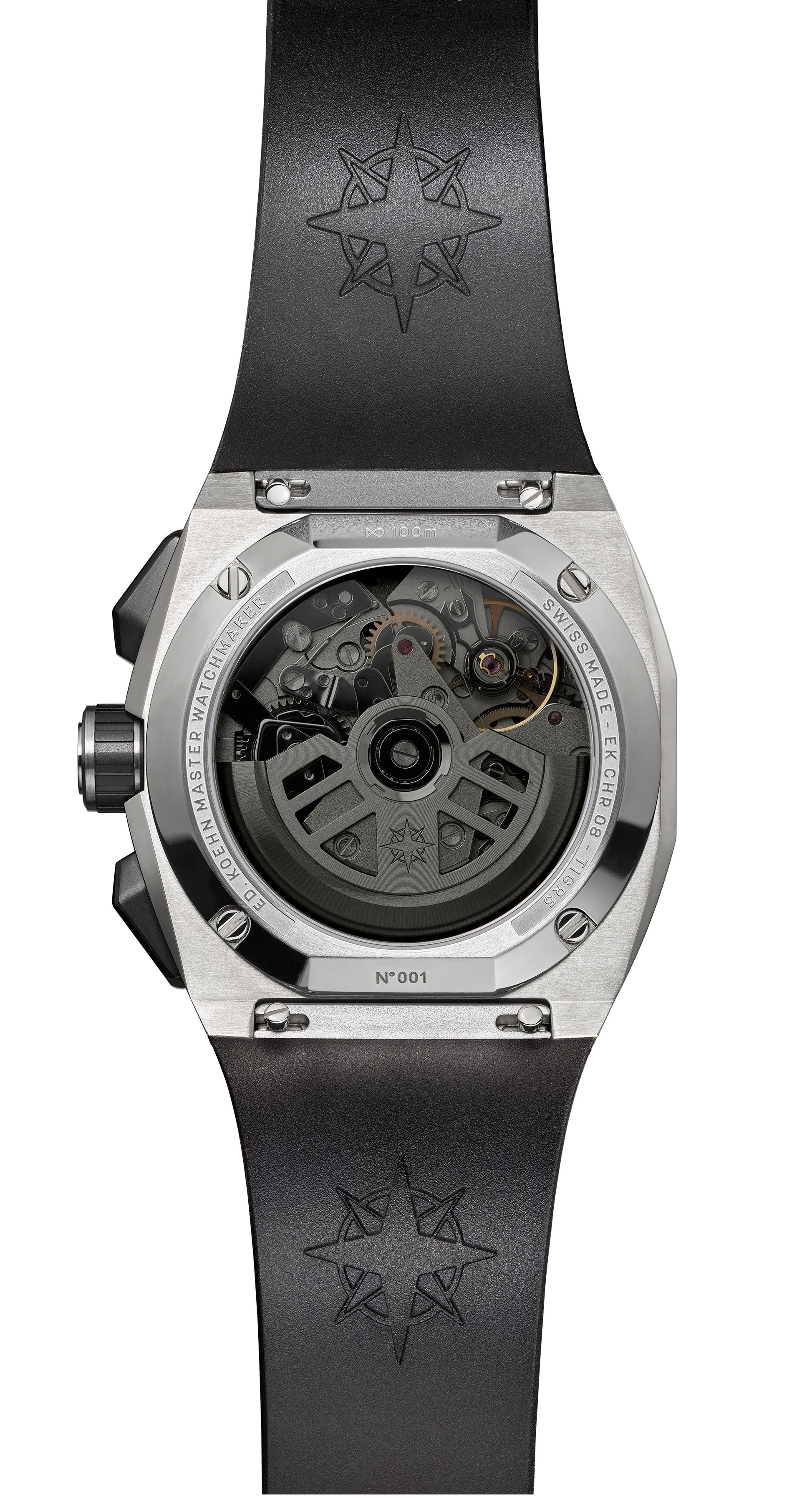 Calibre : EK-CHR-MVT01 Concepto Base –Tri-Compax automatic chronograph, 245 components entirely manufactured in La Chaux-de-Fonds, Switzerland.