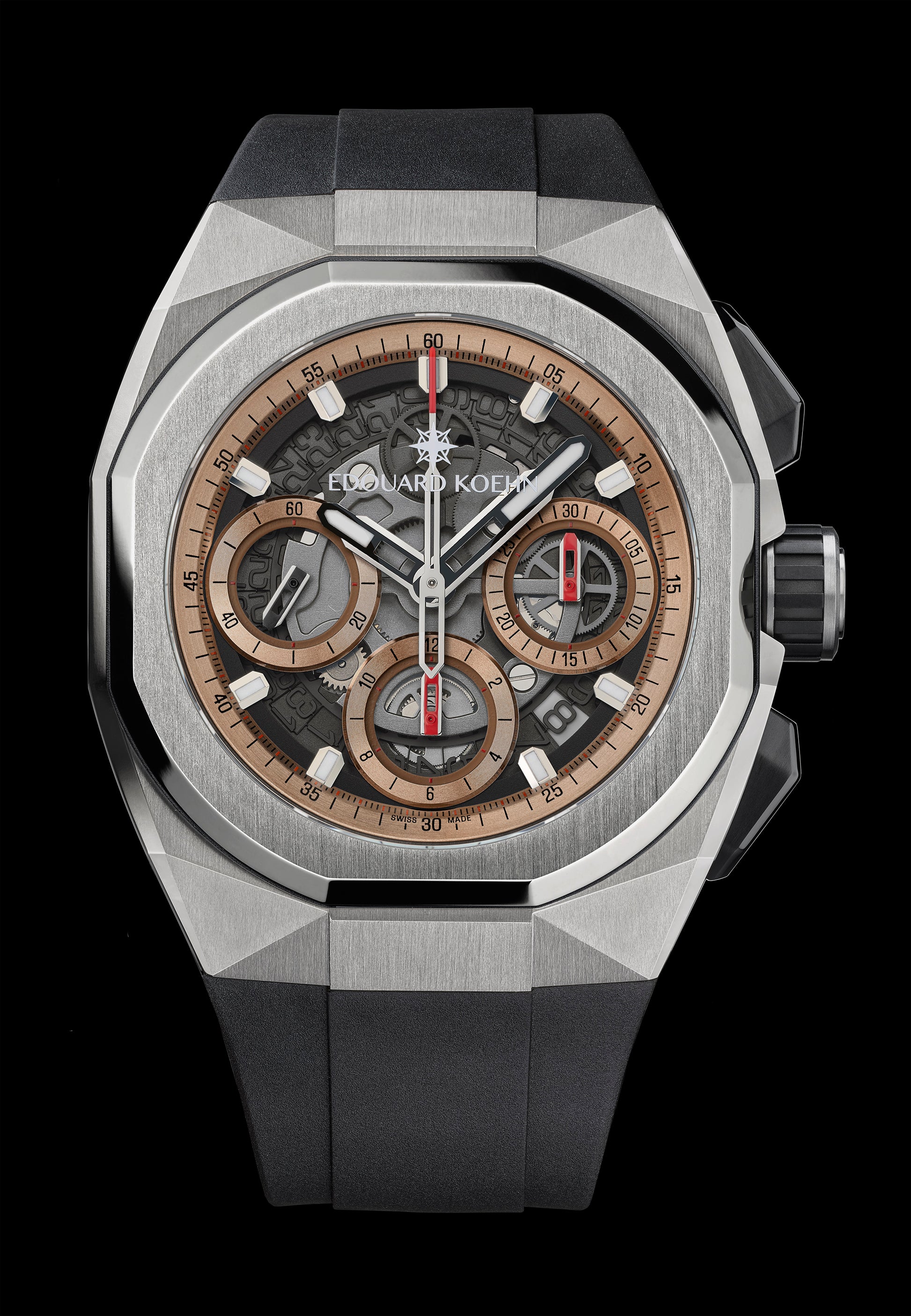 Calibre : EK-CHR-MVT01 Concepto Base –Tri-Compax automatic chronograph, 245 components entirely manufactured in La Chaux-de-Fonds, Switzerland.