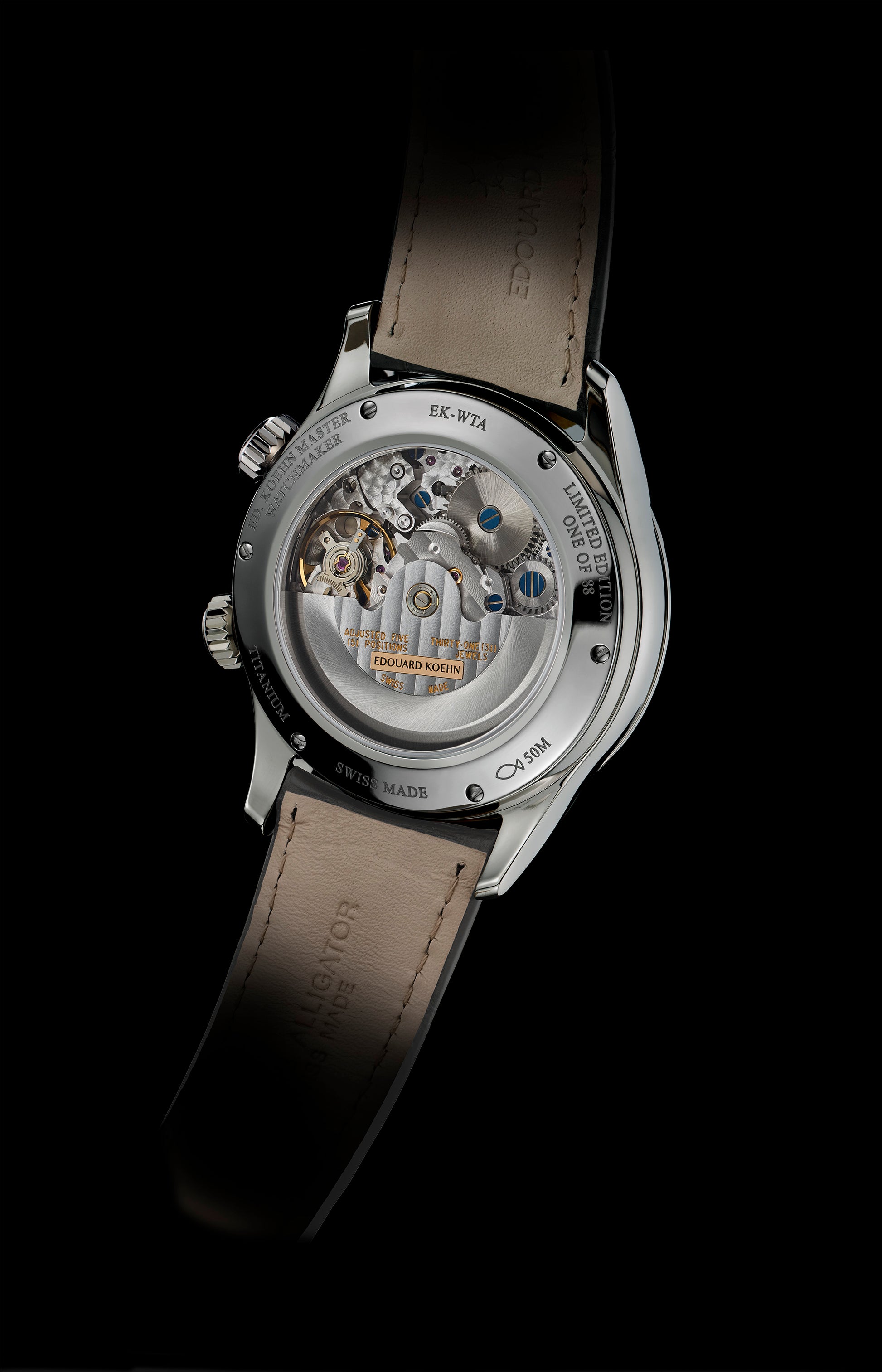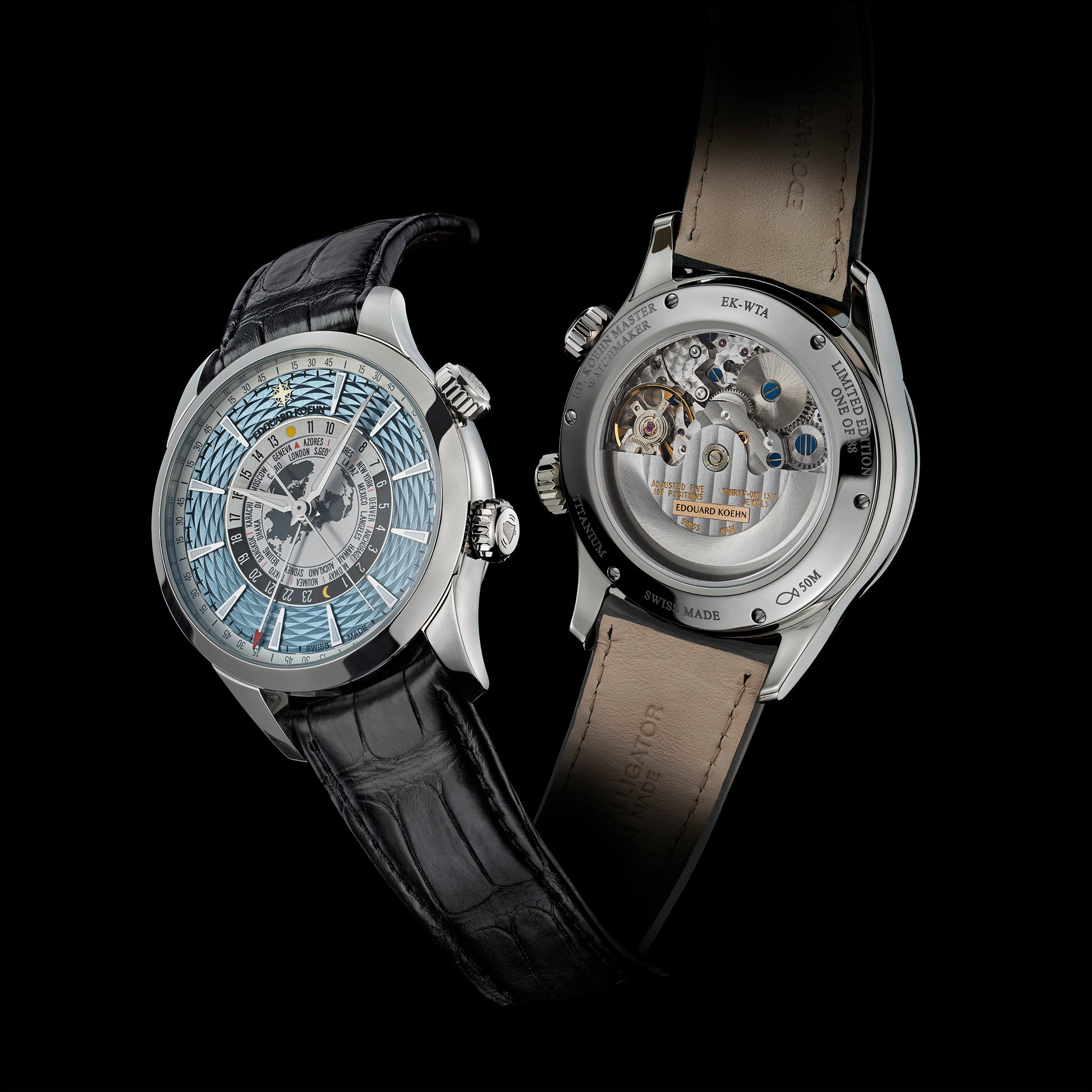 Mechanical self-winding EK-MVTCHR01World Time & Alarm movement. Concepto base calibre modified and personalized for Edouard Koehn, entirely manufactured in La Chaux-de-Fonds, Switzerland, double barrel, automatic winding of the watch and alarm functions. 31 jewels, 28,800 vibrations per hour (4 Hz), oscillating weight mounted on ceramic ball bearings, 48-hour power reserve.