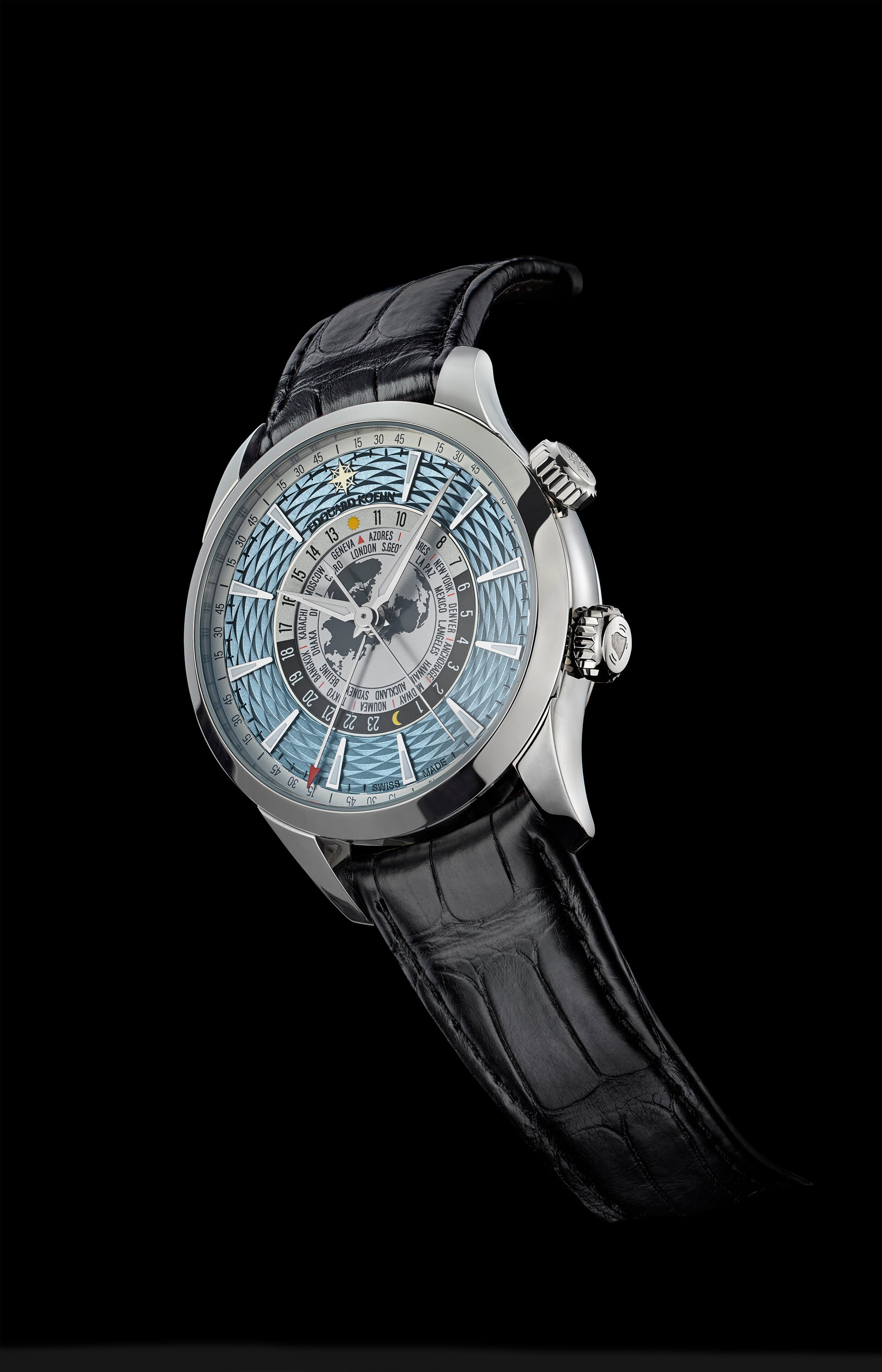 Guillochè dial, applied indexes with luminescent dots (superluminova), matte central disc.