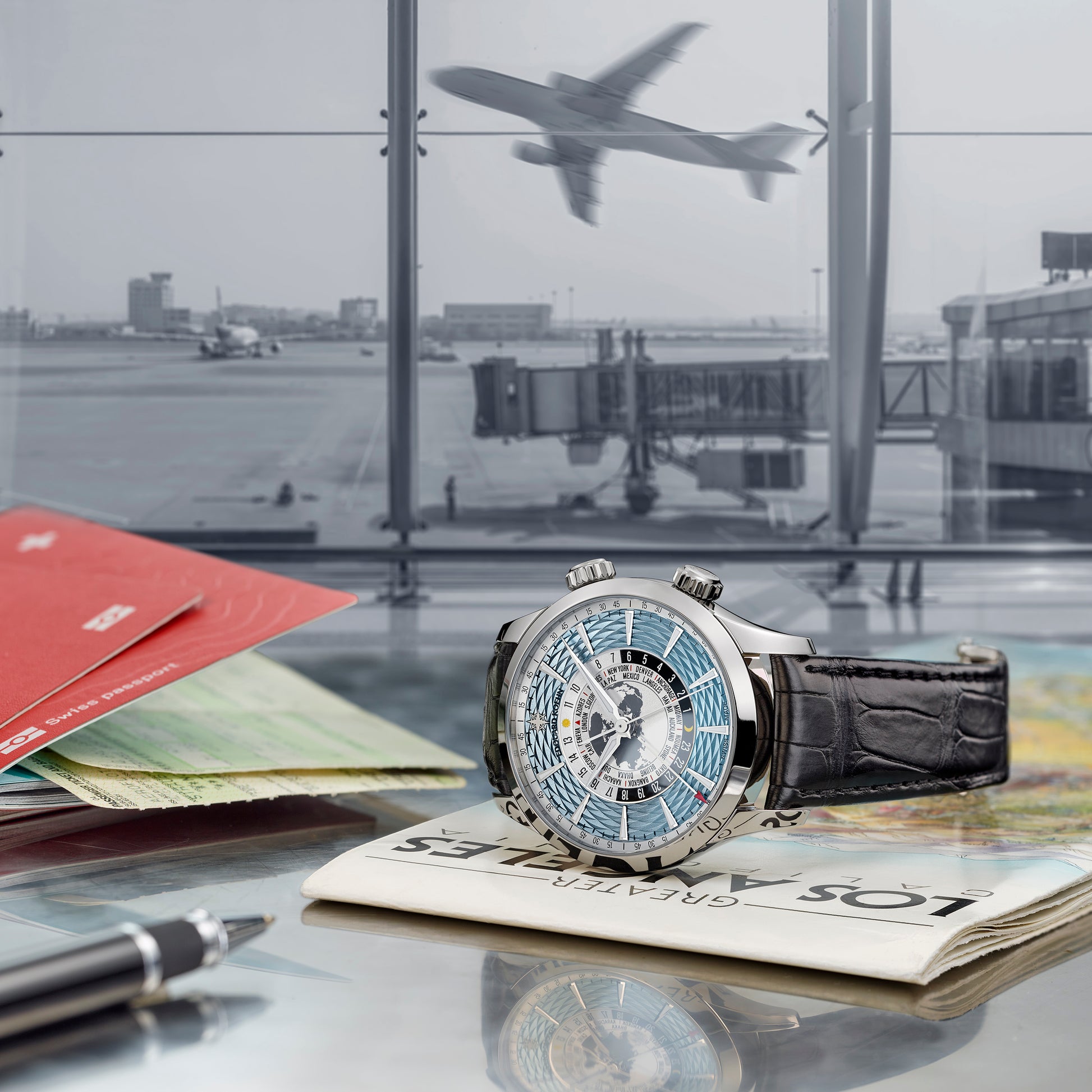 Functions: Hours, minutes, seconds, Universal Time by central 24-hour disc, Alarm by hand.